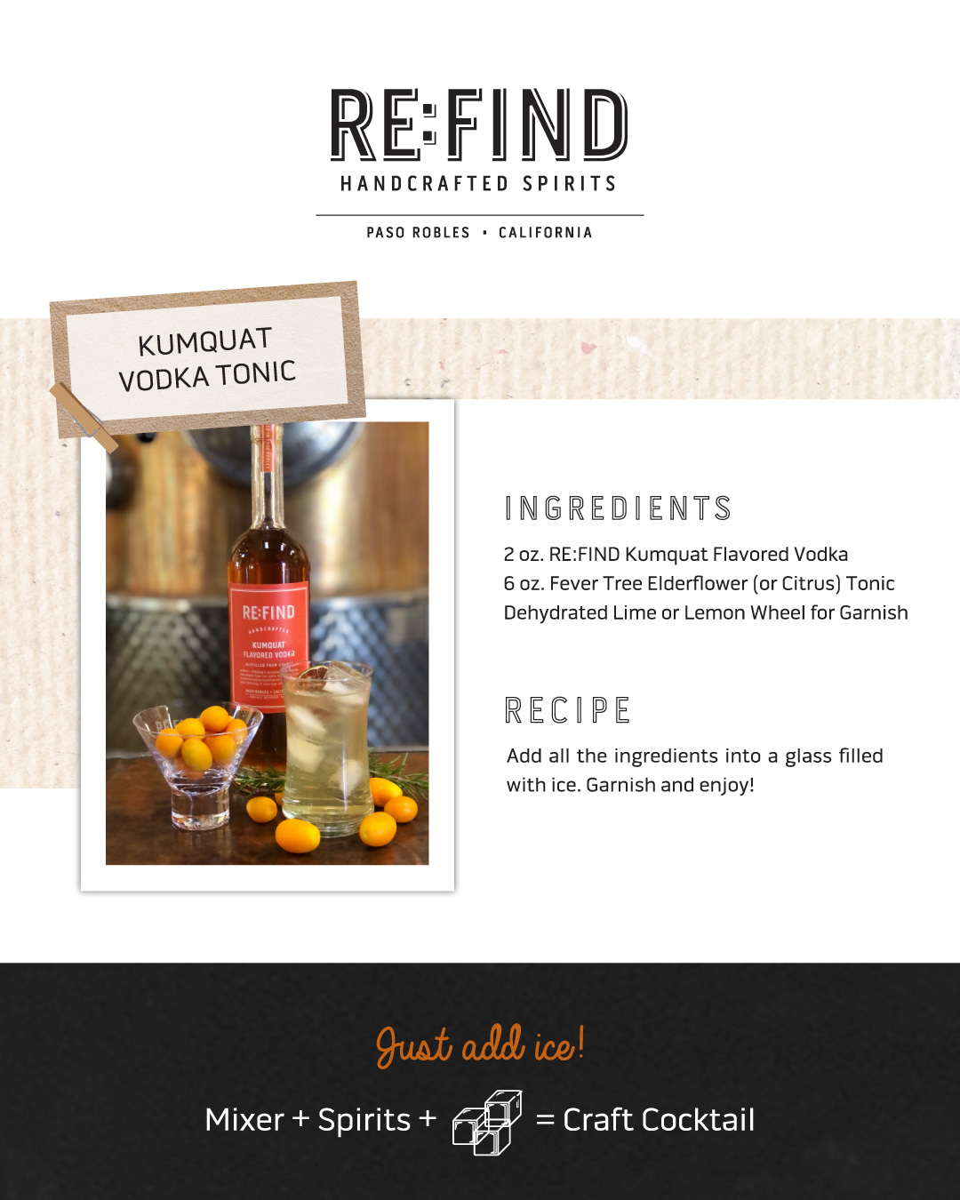 Includes: 1 - Re:Find Kumquat Flavored Vodka (750ml | 40% Alc 80 Proof) 1 - Fever Tree Naturally Light Indian Tonic 1 - Lime Garnish Pack